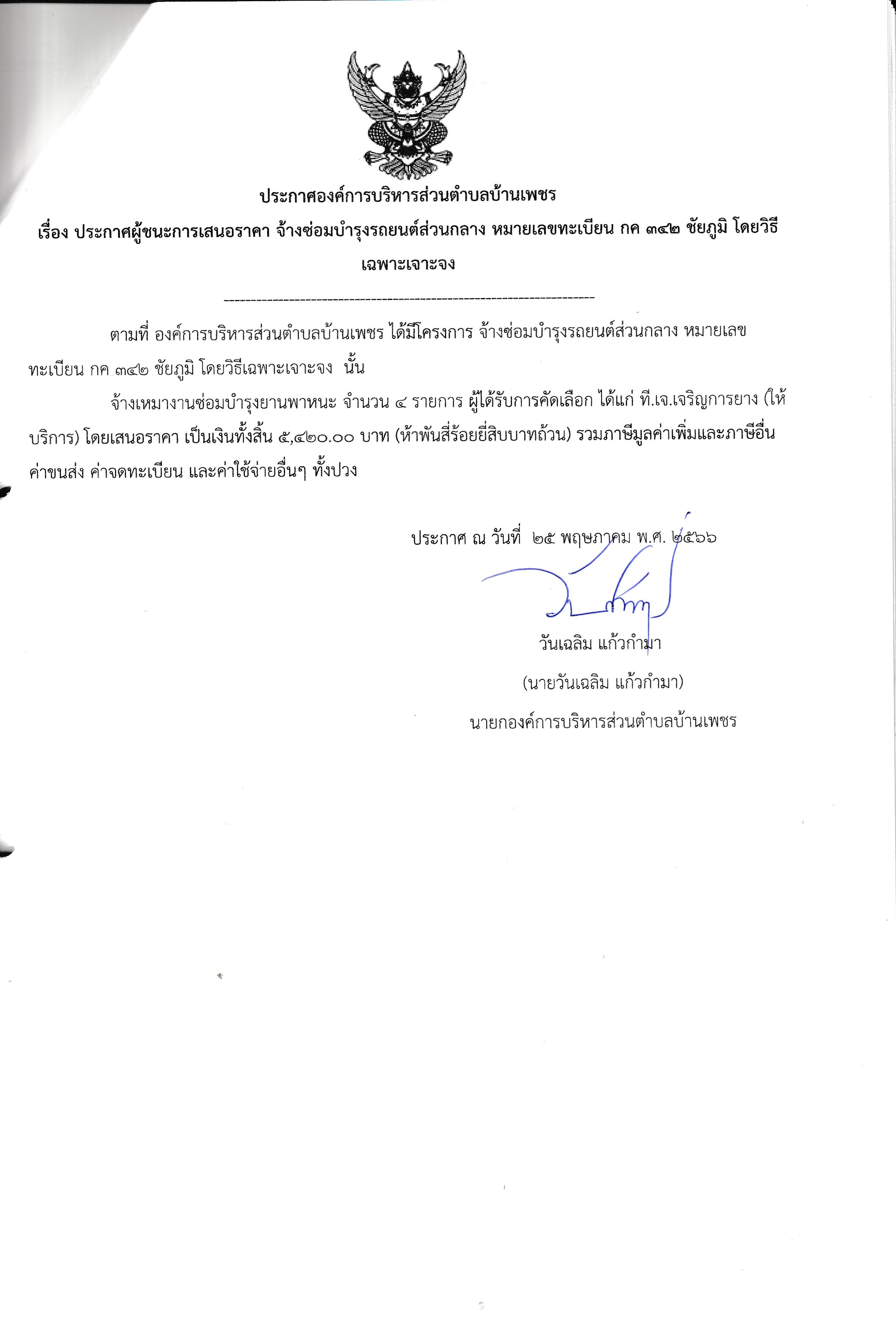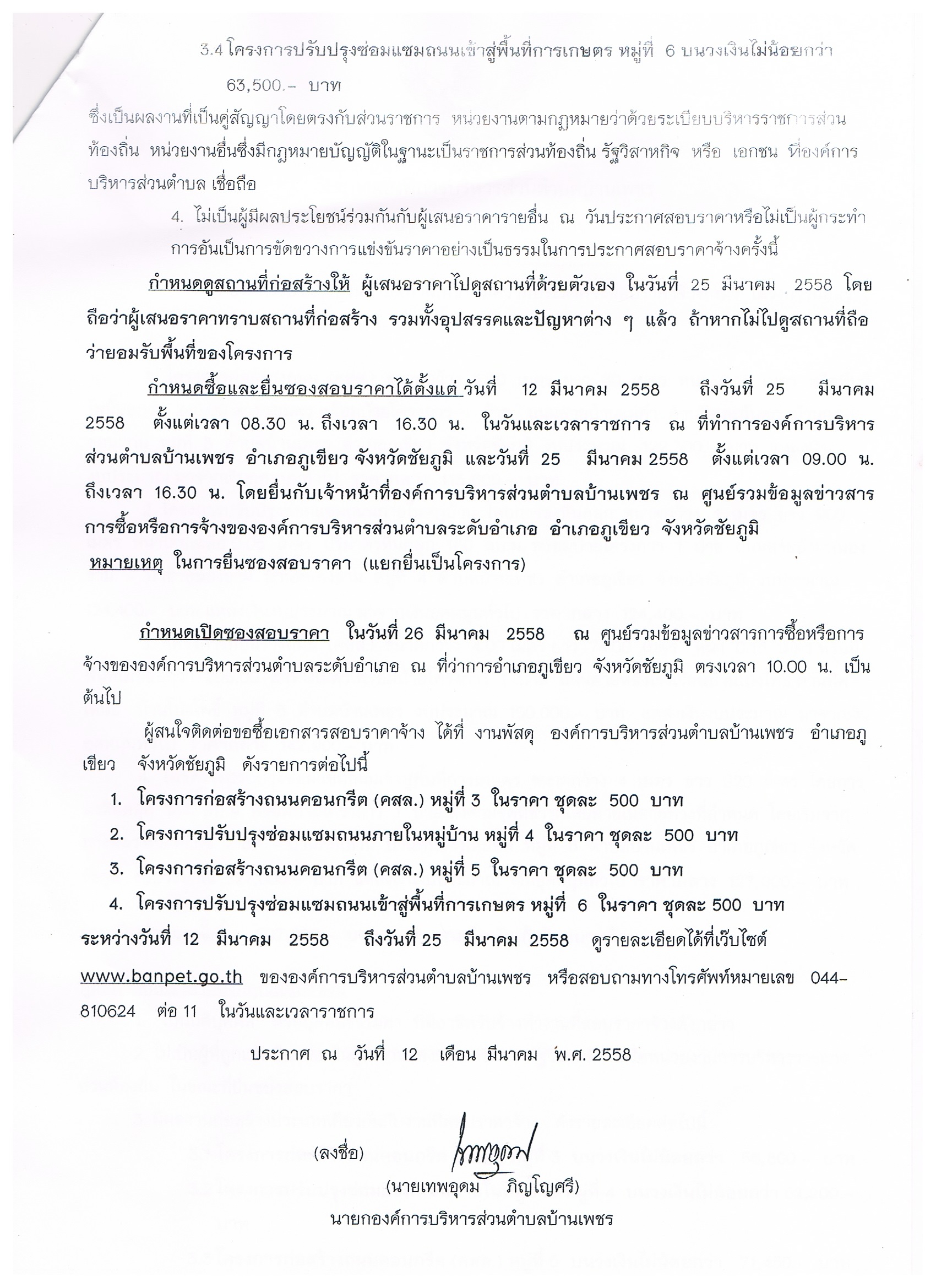 ประกาศผู้ชนะเงินสะสมโครงการถมดินปรับระดับพร้อมปรับแต่งเรียบ สายหลังโรงเรียนเพชรวิทยาคาร - นาผอ.บุญทา |