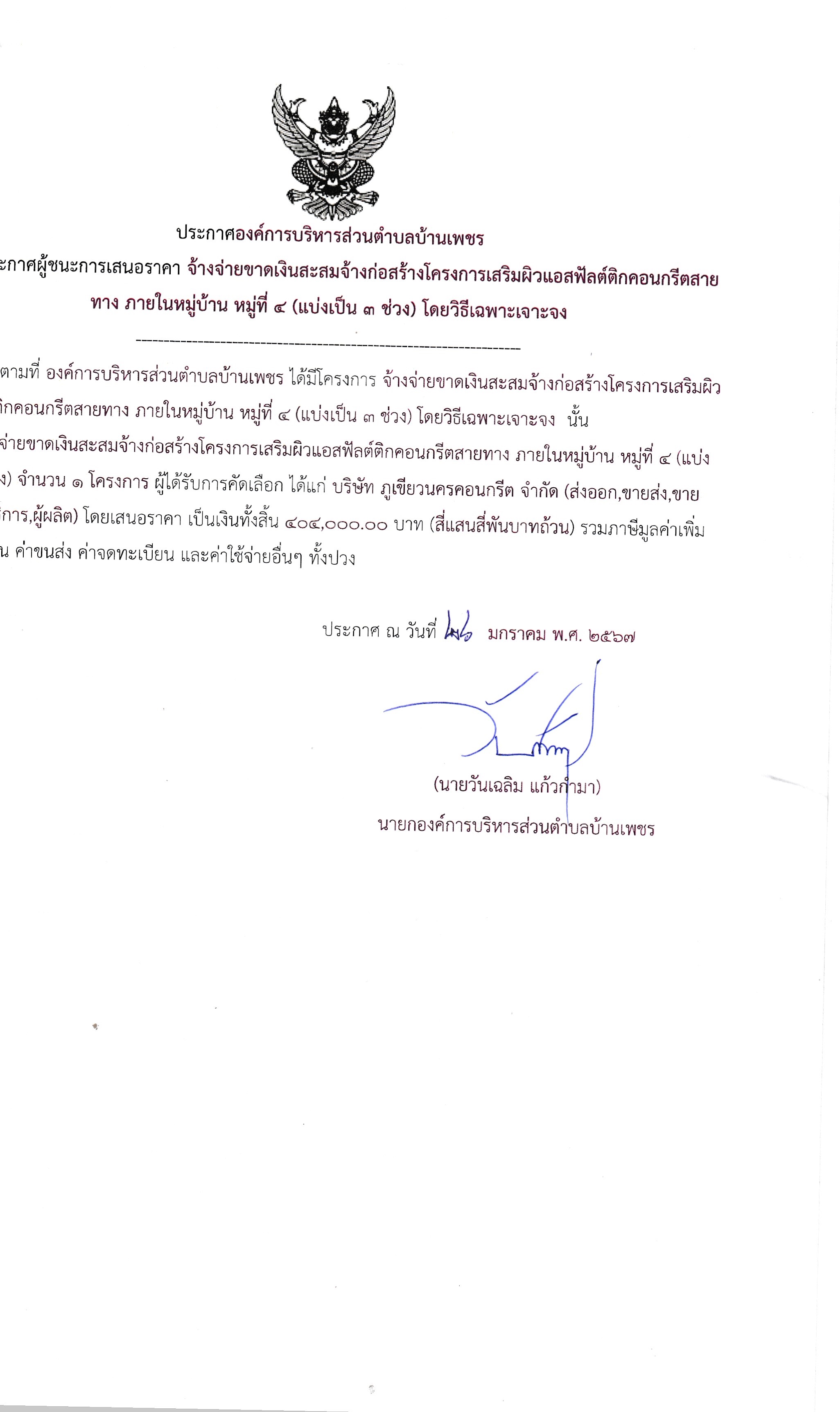 ประกาศผู้ชนะการเสนอราคา เงินสะสมโครงการผิวเสริมแอสฟัลต์ติกคอนกรีต ซอยตรงข้ามวัดเขาทองงาม บ้านหนองขาม หมู่ที่ 4 |