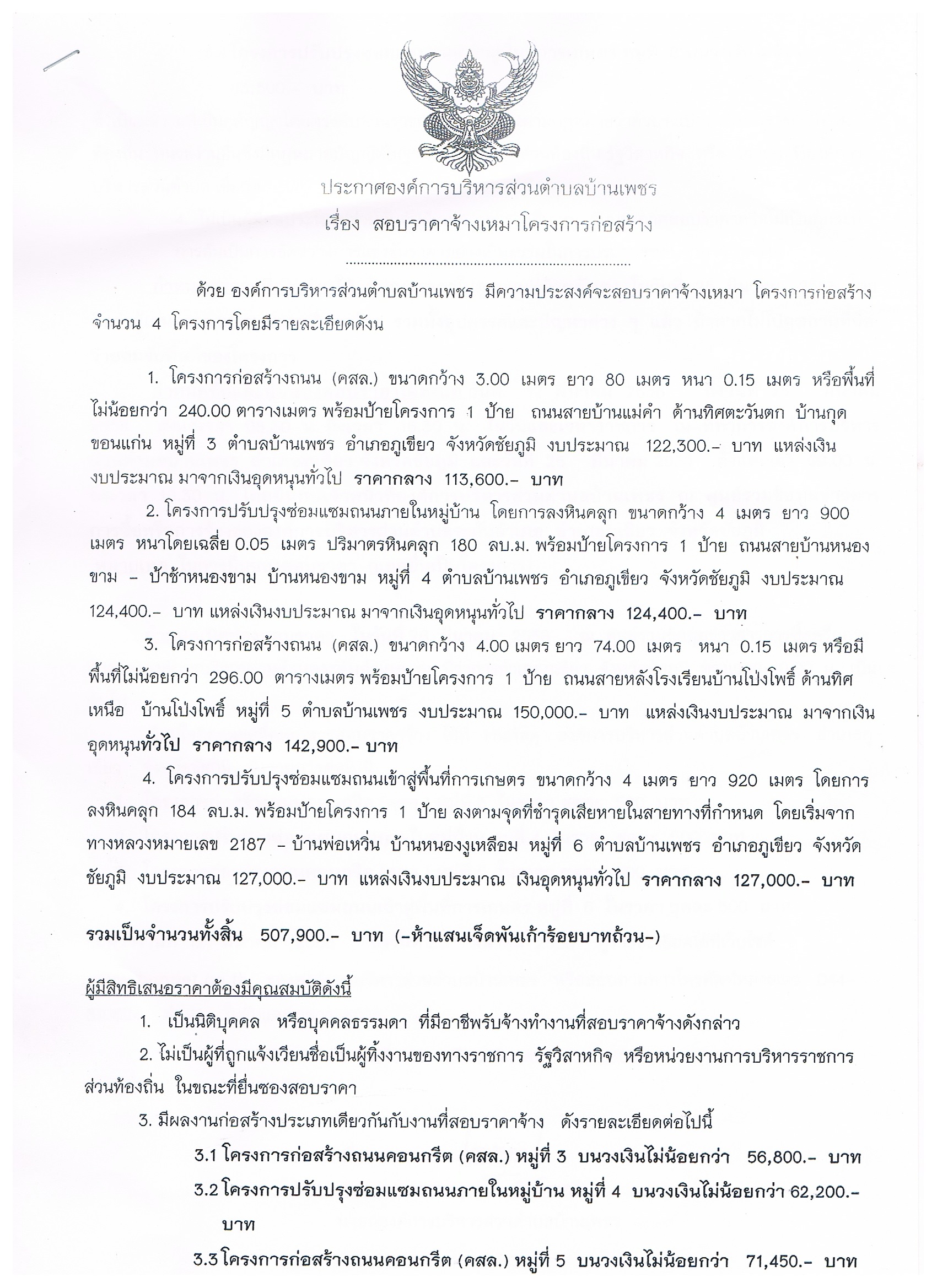 ประกาศสอบราคาจ้างเหมาโครงการปรับปรุถนนเข้าสู่พื้นที่การเกษตรบ้านเพชร หมู่ที่ ๑ |