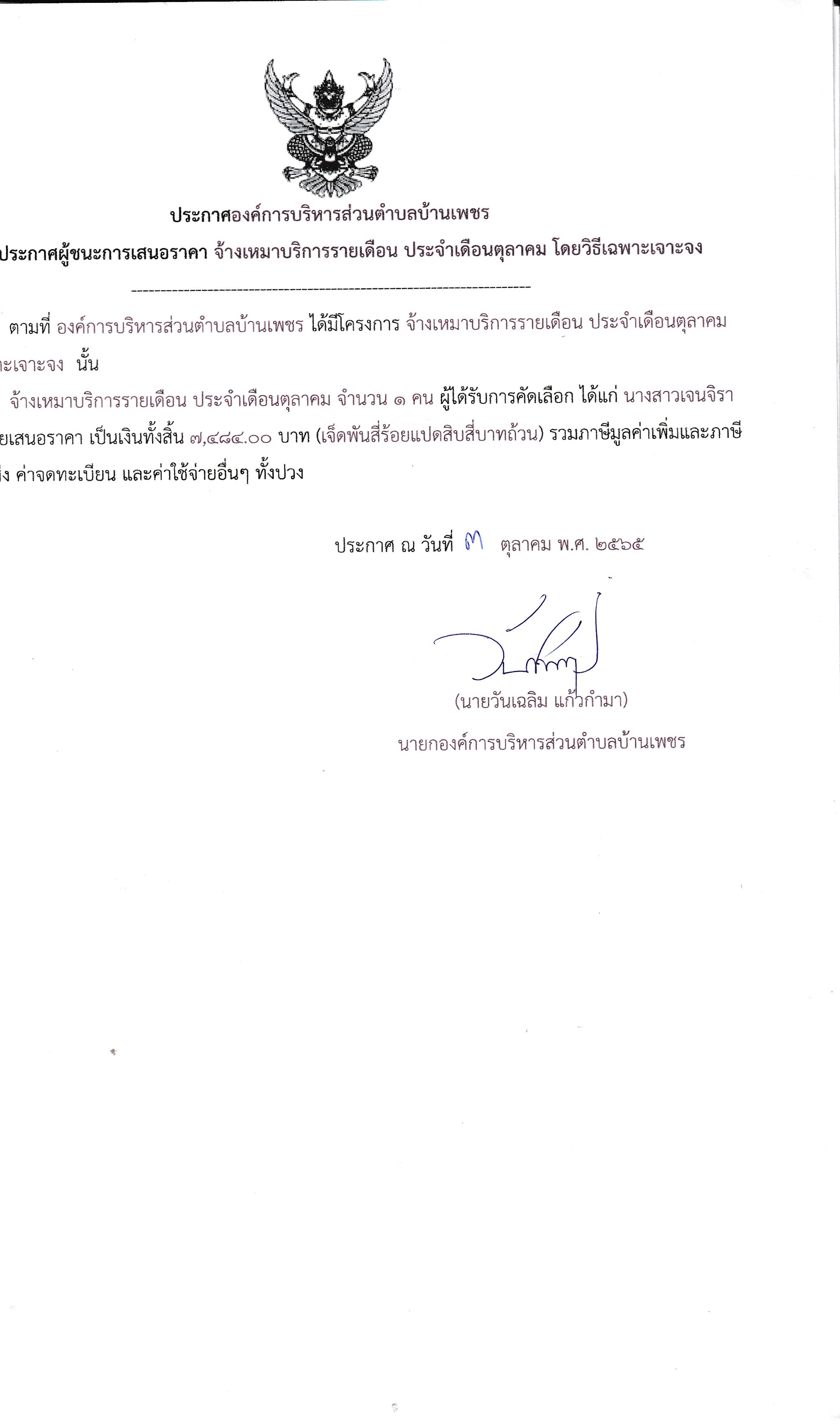 ประกาศผู้ชนะการเสนอราคา ซื้ออาหารเสริม (นม) สำหรับศูนย์พัฒนาเด็กเล็ก องค์การบริหารส่วนตำบลบ้านเพชร |